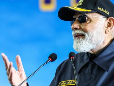 Prime Minister Narendra Modi addresses the armed force personnel during the Deepavali celebration onboard INS Vikrant, off Goa on October 20, 2025.... Read More