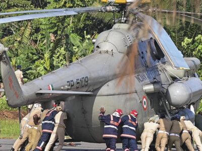 The Police and Fire and Rescue Services personnel try to push President Droupadi Murmu’s helicopter after its wheels got stuck on the... Read More