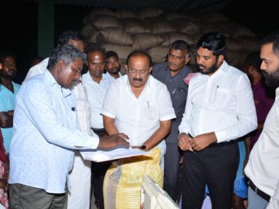 Minister R. Sakkarapani, District Collector P. Akash, and officials inspect the Sikkal Direct Purchase Centre in Nagapattinam district. | Photo Credit: Special... Read More