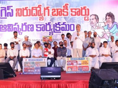 BRS leader T. Harish Rao speaking at a meeting on ‘nirudyoga baki card’ in Hyderabad on Friday. | Photo Credit: By Arrangement... Read More