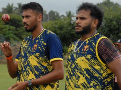 Karnataka’s Vidwath Kaverappa and V. Vyshak at a practice session ahead of the Ranji Trophy match against Goa in Shivamogga on Friday,... Read More