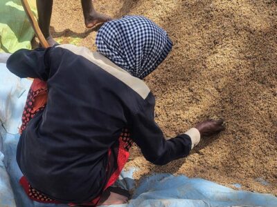 A woman farmer separating sprouted grains from the paddy mound at the Alakudi direct purchase centre on Saturday. | Photo Credit: V.Venkatasubramanian... Read More