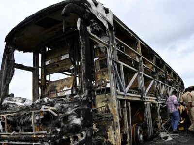 Investigation in progress by members of APFSL and police of the ill fated bus in Kurnool on October 24, 2025. | Photo... Read More
