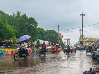 People traveling in the rain caused by the low-pressure area formed over the Bay of Bengal at NTR circle near Addanki busstand... Read More