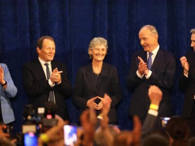 Catherine Connolly, centre, is congratulated by Heather Humphreys, her husband Brian McEnery, Taoiseach Micheal Martin, (Irish Prime Minister) and Tanaiste Simon Harris... Read More