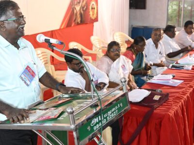 C. Thiruvetai, State vice-president of Centre of Indian Trade Unions, addressing a conference in Madurai on Saturday. | Photo Credit: G. MOORTHY... Read More