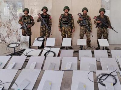 In this image provided by the Myanmar military on Oct. 19, 2025, soldiers stand next to Starlink machines as they seize KK... Read More