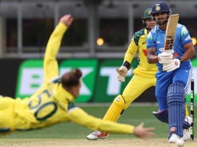 Australia’s Matthew Kuhneman tries to stop the ball from a shot by Nitish Kumar Reddy during the first one-day international cricket match... Read More