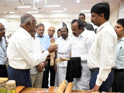 Minister for Housing, Prohibition and Excise, S. Muthusamy (second right) viewing bamboo products at an exhibition held at the Collectorate in Erode... Read More