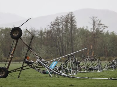Farm irrigation equipment lays on the ground after it is damaged by strong winds in Waiau, New Zealand, Thursday, Oct. 23, 2025.... Read More