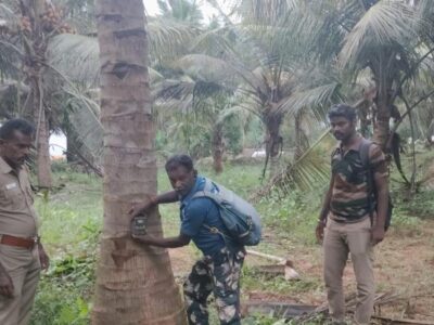 Forest Department staff installing a camera trap at a farm in Ettimadai, Coimbatore district, on Wednesday. | Photo Credit: Special Arrangement The... Read More