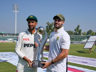 Pakistan’s Shan Masood and South Africa’s Aiden Markram pose for photograph with the Test trophy in Rawalpindi, on October 23, 2025 |... Read More