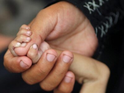 Palestinian mother Amira Muteir holds the hand of her five-month-old baby Ammar, whom she says is wasting away from malnutrition, in Gaza... Read More