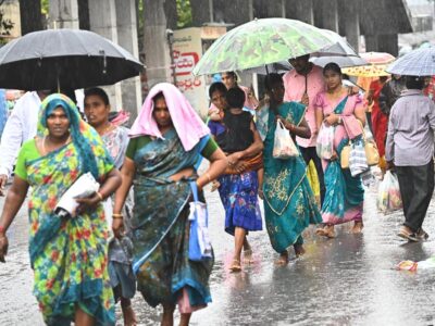 Pedestrians covering themselves with an umbrella as Vijayawada receives moderate showers on Thursday. | Photo Credit: K.V.S. GIRI A fresh low-pressure area... Read More