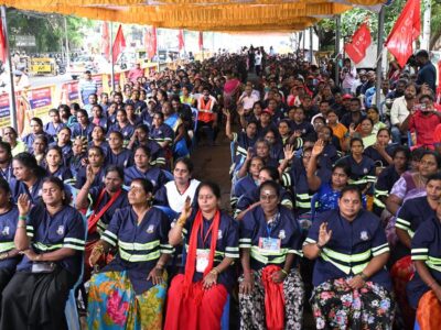 Conservancy workers protesting for permanent jobs under the Greater Chennai Corporation at the Rajarathinam Stadium on Saturday. | Photo Credit: S.R. RAGHUNATHAN... Read More