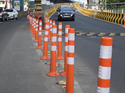 Temporary structures placed near the down ramp of G.D. Naidu flyover in Coimbatore city to avoid accidents. | Photo Credit: PERIASAMY M.... Read More