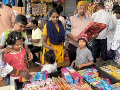 Locals at a cracker stall in Mysuru on Sunday. | Photo Credit: SRIRAM M.A. Intermittent rains during the day coupled with a... Read More