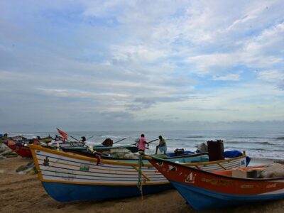 Fishermen prepare their fishing nets at Besant Nagar beach in Tamil Nadu’s Chennai on October 24, 2025. | Photo Credit: The Hindu... Read More