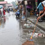 Conservancy workers of Madurai Corporation clearing garbage at East Masi Street in Madurai on October 21, 2025, a day after Deepavali festival