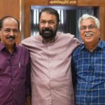 Civil Supplies Minister G R Anil and CPI State Secretary Binoy Viswam flank General Education Minister at the CPI headquarters at M N Smarakam in Thiruvanthapuram on Saturday