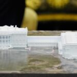 A model of the White House and the new ballroom, right, as seen on a table as President Donald Trump meets with NATO Secretary General Mark Rutte in the Oval Office of the White House, in Washington on October 22, 2025.
