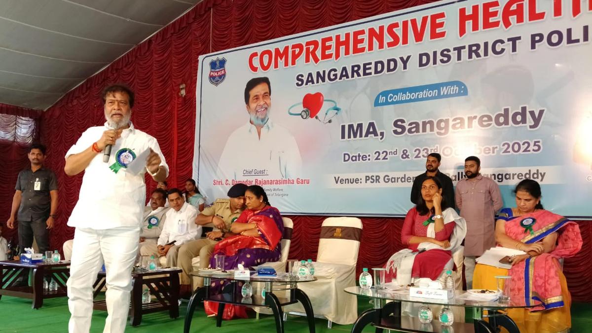 Health Minister C. Damodar Raja Narsimha at the comprehensive health camp for organised in Sangareddy on Wednesday (October 22, 2025)