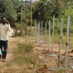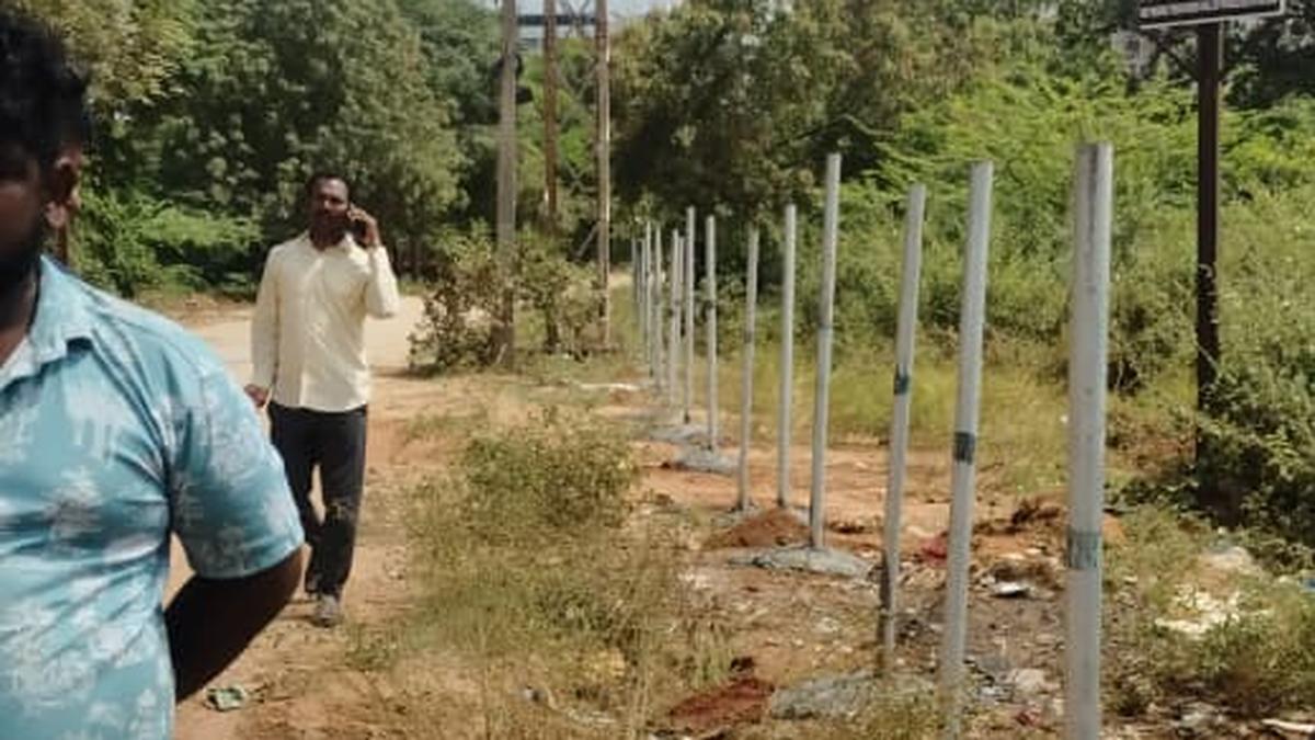HYDRAA personnel erecting fencing around the 38 acre land in Pet Basheerabad in Qutbullahpur mandal of Medchal Malkajgiri district on Wednesday