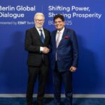 Union Minister of Commerce and Industry Piyush Goyal exchanges a handshake with founder and chair of Berlin Global Dialogue Lars-Hendrik Röller, at the European School of Management and Technology, in Berlin on Thursday, October 24, 2025. Photo credit: X/@PiyushGoyal