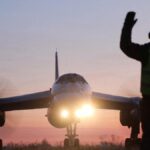 A ground crew marshaller guides a Russian Tu-95MS nuclear-capable strategic bomber performing a flight over neutral waters in the Sea of Japan, in this still image taken from a video released on October 24, 2025.