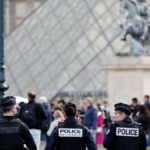 French police walk near the glass Pyramid of the Louvre Museum as the museum remains closed the day after a spectacular jewel heist by thieves who broke into the landmark by using a crane and smashing an upstairs window, stealing priceless jewelry from an area that houses the French crown jewels before escaping on motorbikes, in Paris, France, October 20, 2025.
