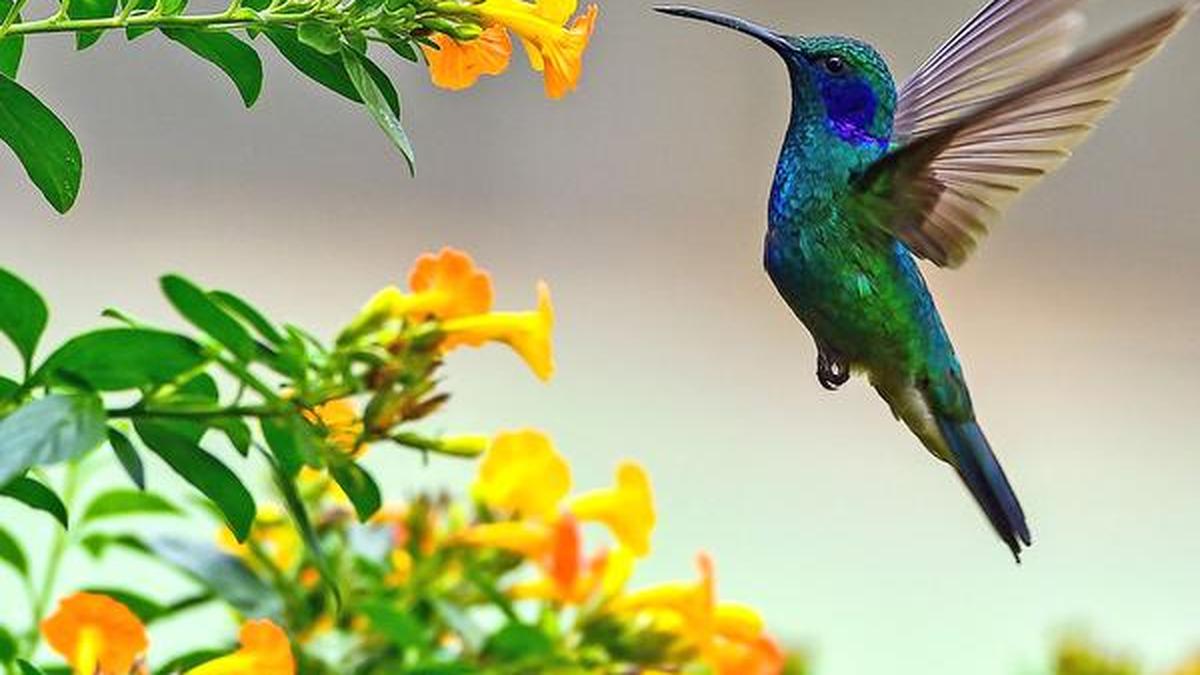 A hummingbird feeds in Boquete, Panama. Hummingbirds are known for their ability to hover by flapping their wings 15 to 80 times per second, depending on the bird’s size.