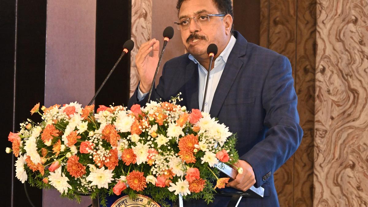 New Mangalore Port Authority Chairman A.V. Ramana speaks at a stakeholders’ meeting ahead of the Port Authority’s participation in India Maritime Week 2025 (October 27 to 31) in Mumbai on Thursday, October 23, in Mangaluru.