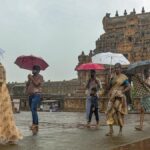 Pilgrims make their way across the wet courtyard with umbrellas as rain lashes Big Temple in Thanjavur on Tuesday.