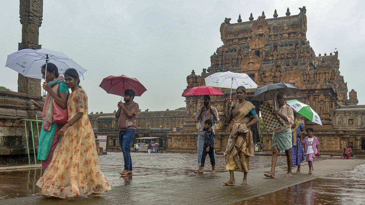 Pilgrims make their way across the wet courtyard with umbrellas as rain lashes Big Temple in Thanjavur on Tuesday.
