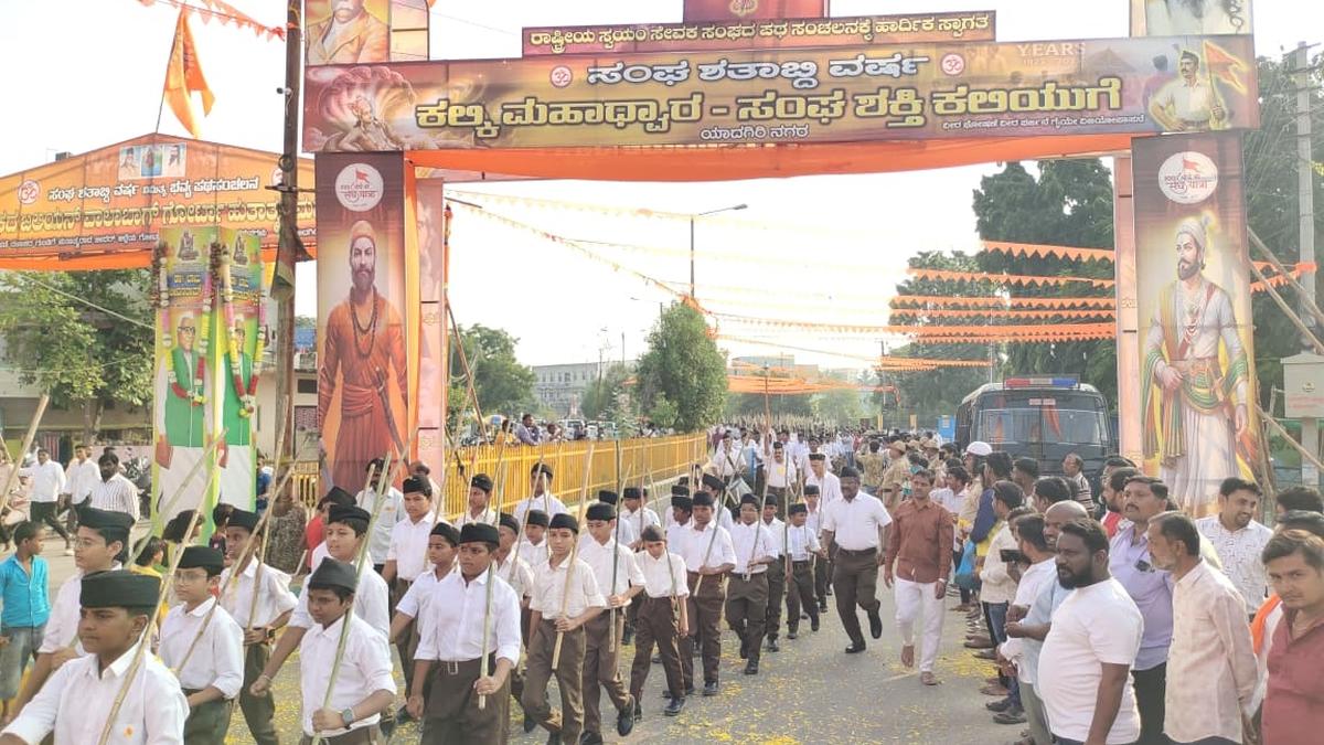 RSS march under way in Yadgir on Sunday. | Photo Credit: SPECIAL ARRANGEMENT Several hundred Rashtriya Swayamsevak Sangh (RSS) activists participated in a march taken out in Yadgir on Sunday to mark the centenary celebration of its establishment. The march of activists wearing Ganavesh (RSS uniform) started from the City Municipal Council office and ended... Read More