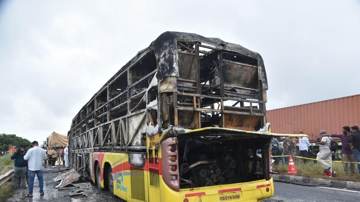 The private travel bus that went up in flames after hitting a bike at Chinnatekur on the outskirts of Kurnool on October 24, 2025 | Photo Credit: U. Subramanyam Prime Minister Narendra Modi on Friday (October 24, 2025) expressed grief over the loss of lives in a bus fire incident in Andhra Pradesh’s Kurnool district.... Read More