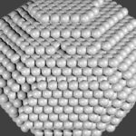 Idealised model of a platinum nanoparticle about 2 nm wide, showing individual atoms.