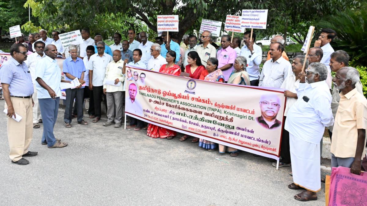 Members of Tamil Nadu Pensioners Association staging a demonstration in Krishnagiri on Friday.