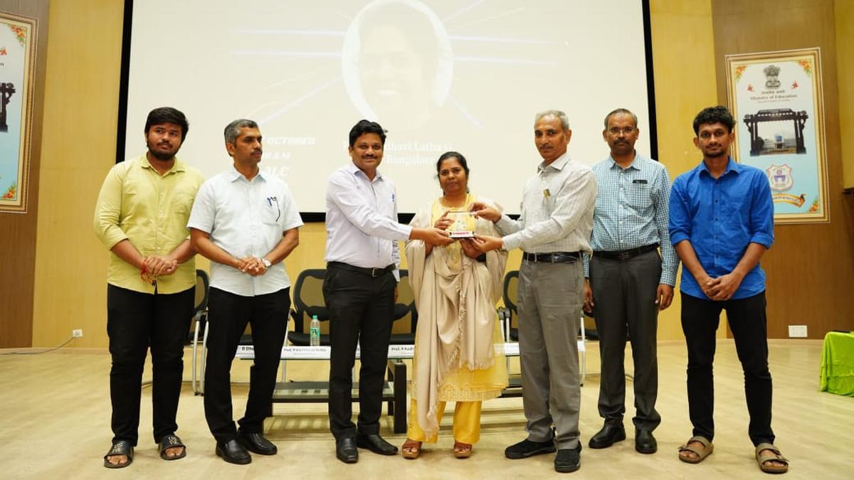 Prof. G. Madhavi Latha, Professor from IISc Bangalore, who played a crucial role in designing the world’s highest railway bridge over the Chenab, being felicitated with a memento during the Technozion event at NIT Warangal on Friday.