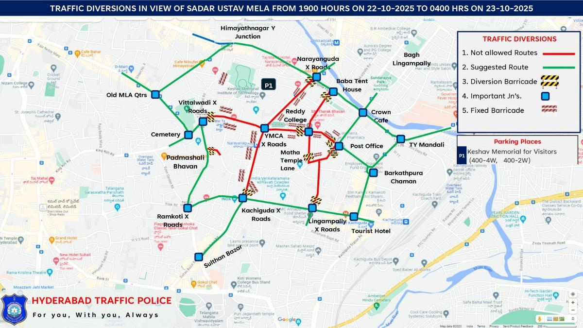 The Hyderabad Traffic Police on Tuesday (October 21, 2025) issued a traffic advisory in connection with the Sadar Utsav to be held at YMCA in Narayanaguda from 7 p.m. on Tuesday (October 22, 2025) to 4 a.m. on Wednesday (October 23). Vehicular movement will be regulated and diverted at several points around the area to ensure smooth traffic flow.