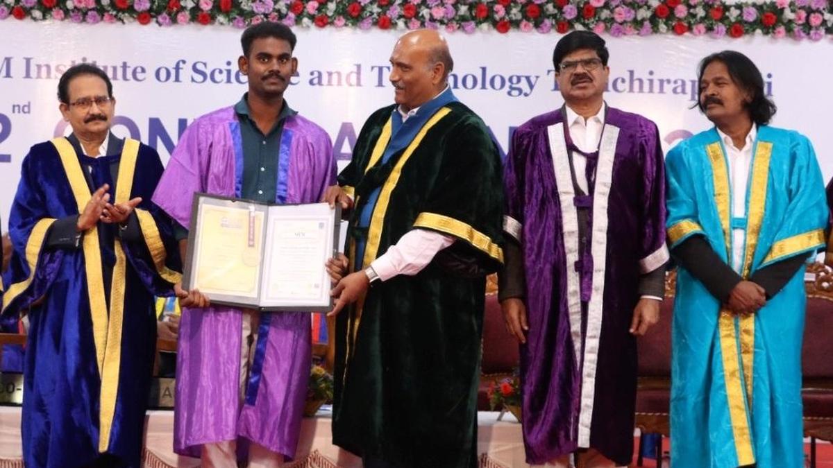 A student receiving his degree from Magesh Ethirajan, Director-General, Centre for Development of Advanced Computing (C-DAC) at the convocation ceremony at SRM Institute of Science and Technology, Tiruchi on Saturday.