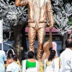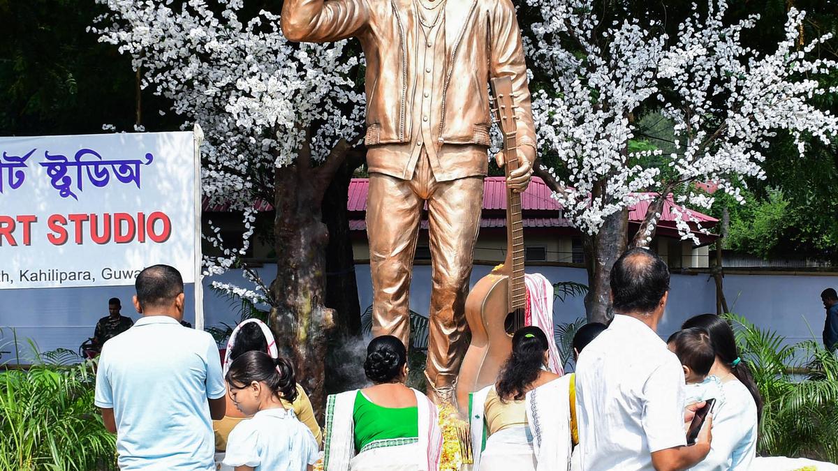 People pay tribute at the newly unveiled statue of late singer Zubeen Garg, in Guwahati.
